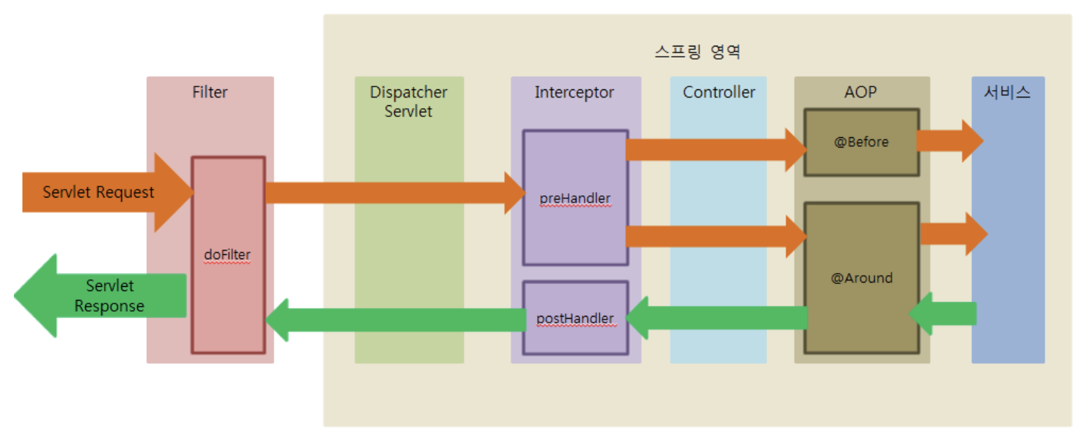 흐름: Filter -> InterCeptor -> AOP -> InterCeptor -> Filter