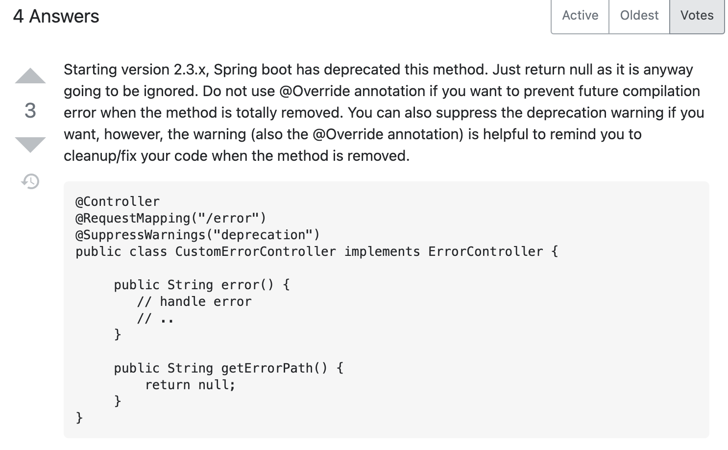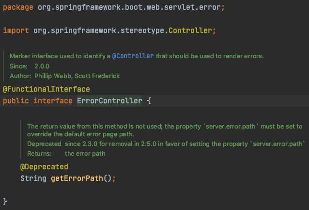 getErrorPath() 메소드가 Deprecated되어있다. springboot 2.5.0 이상 버전부터는 아예 삭제가 된다. 이 메소드는 외부설정파일의 server.error.path에 등록하는 것으로 변경되었다. (공식문서 참고)