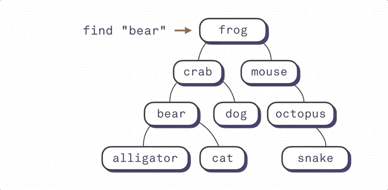 위의 그림을 보면, bear라는 데이터를 찾을때 2번의 연산으로 찾는다. 이런 구조를 가진 Binary Search Tree 자료구조는 데이터가 많아져도 복잡도가 크게 증가하지 않는다는 장점이 있다.