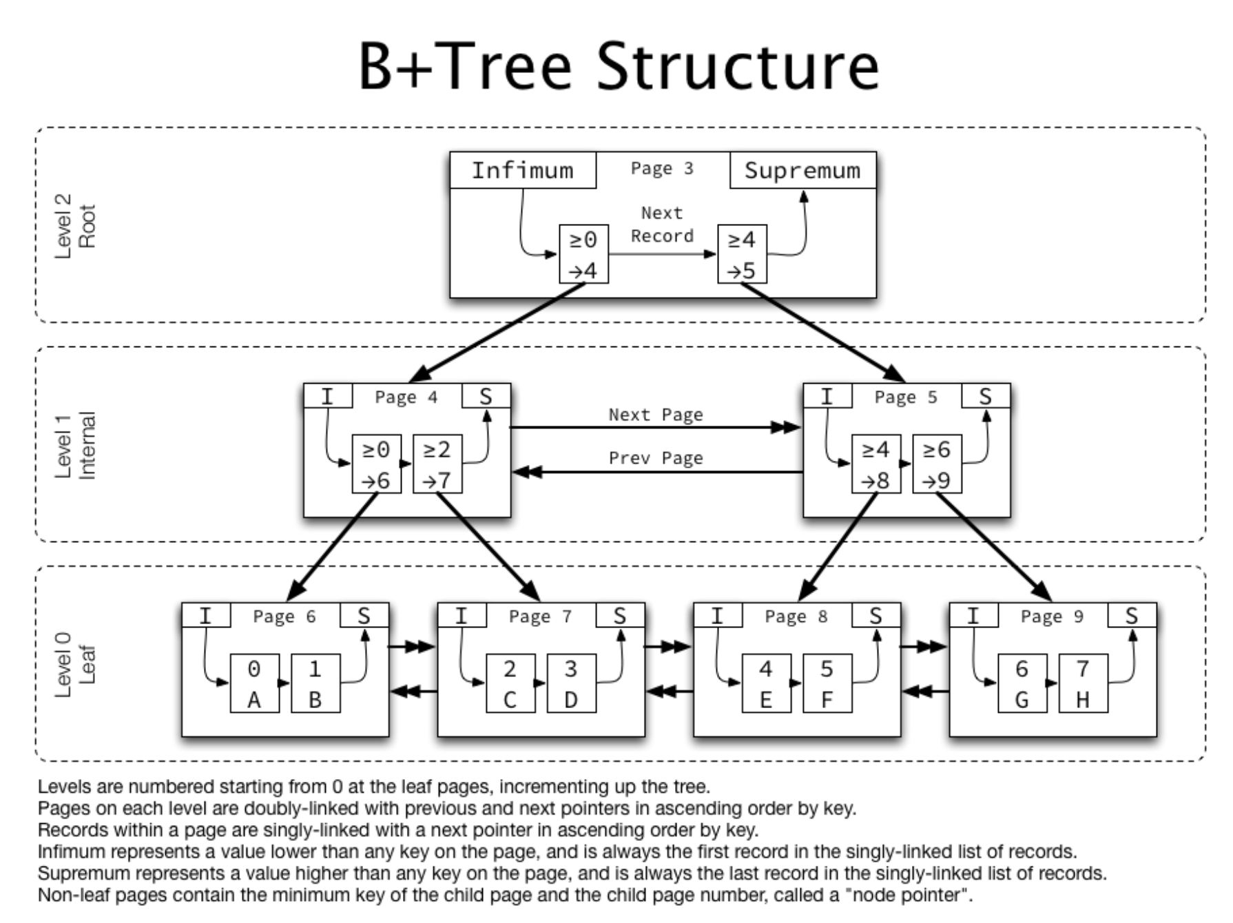 기존의 B-Tree를 개선하여 나온 개념이다. 기존의 B-Tree의 특징을 따라가되, 몇가지 개선된 차이점이 존재하며, 가장 큰 차이점은 기존 B-Tree에서는 노드에 담기는 내용을 Key와 Data(=Value)를 모두 담아서 사용한다. 하지만 B+Tree는 리프노드를 제외한 나머지 노드에는 Data(=Value)를 저장하지 않는 특징이 있고, 리프노드끼리 LinkedList로 연결되어 있다.