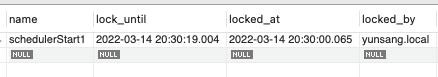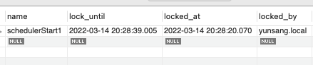 schedulerStart1 이름의 2022-03-14 20:30:00 ~ 2022-03-14 20:30:19 까지 Lock이 yunsang.local에 의해 걸려있는 상태. 시간데이터가 업데이트 되었다.