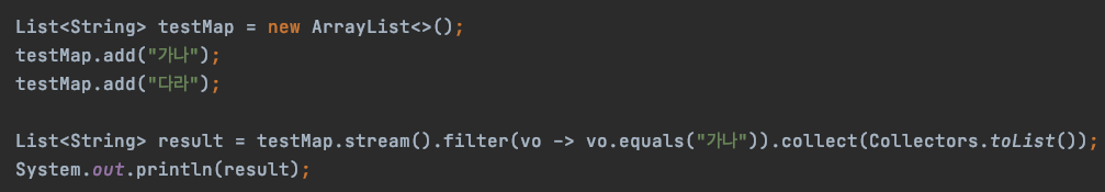 스트림의 연산은 중간연산과 최종연산으로 나누어지며, 위의 예제에서는 중간연산으로 filter(조건에 맞는 것을 찾음)가 사용되었고, 최종연산으로 collect이 사용된 케이스이다.