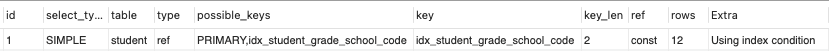 possible_keys에 PRIMARY와 방금 만든 index_student_grade_school_code 복합키가 후보군으로 보이고, 실제 사용한건 새로 만든 복합키가 사용되는 모습이다.