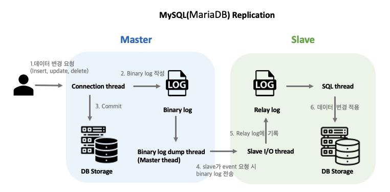 - Master -> Slave 순서로 동작처리를 진행해야 한다. (binary log파일 기록 -> 복제 진행)
