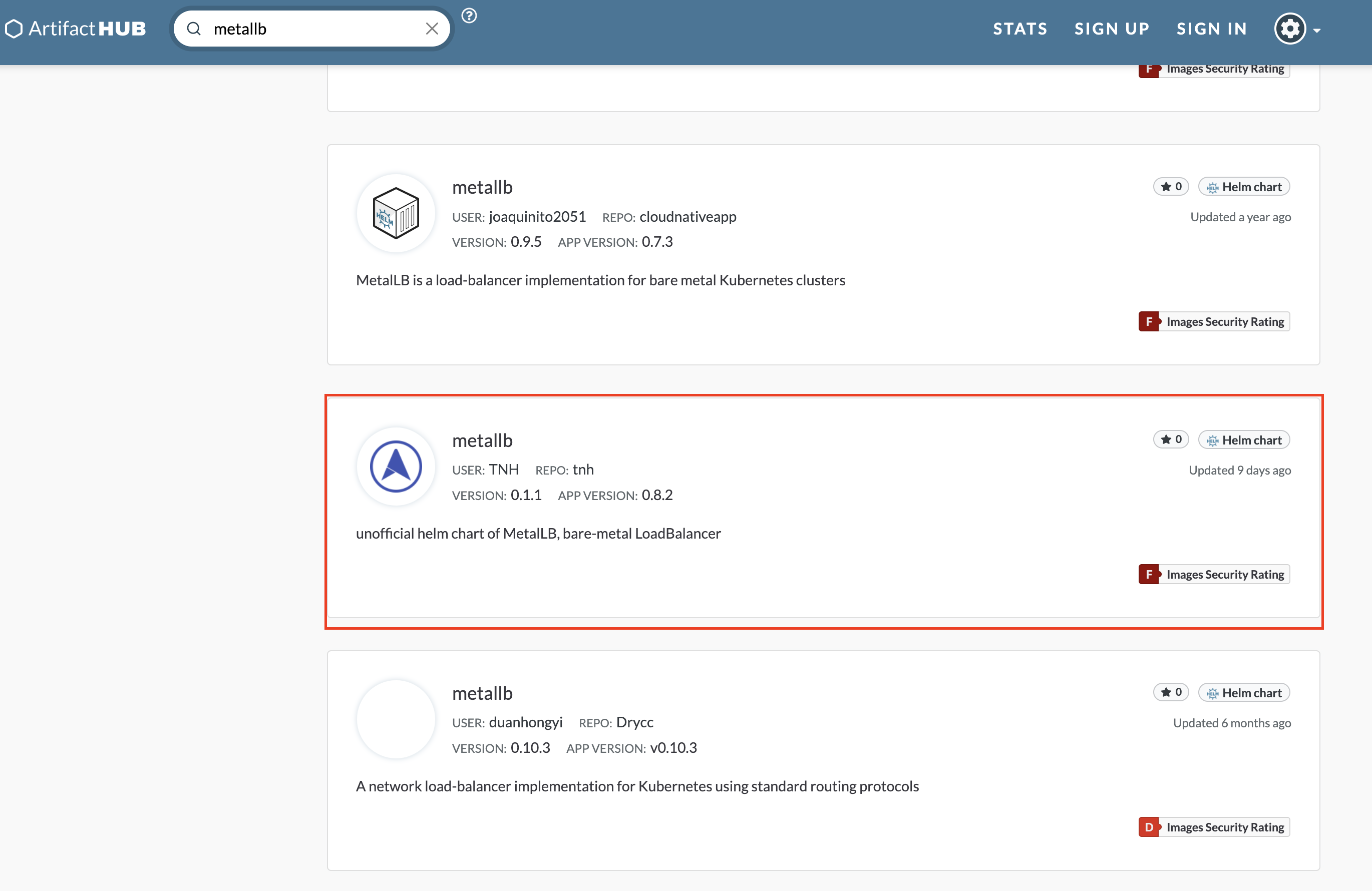 예제에서는 차트저장소에서 metallb로 검색하여 확인한 차트를 사용한다.